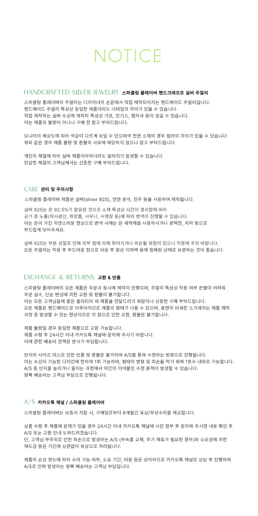 개인의 체질에 따라 실버 제품이라도 알레르기가 발생할 수 있습니다. 이는 불량 및 교환, 환불의 사유가 되지 않으므로, 민감한 체질의 고객님께서는 신중한 구매 부탁드립니다.