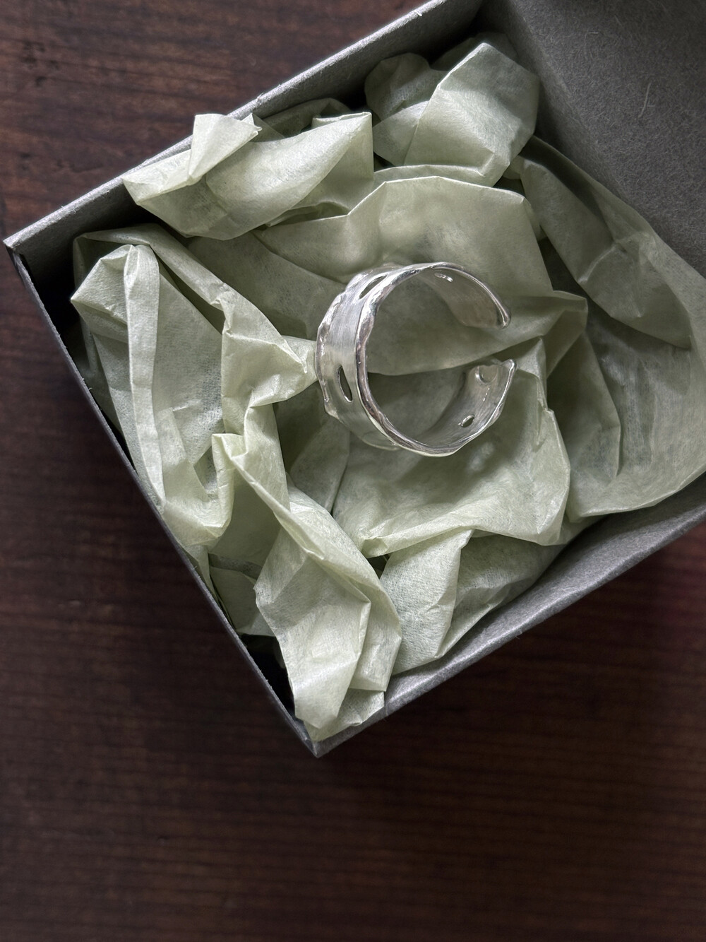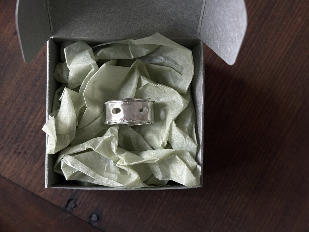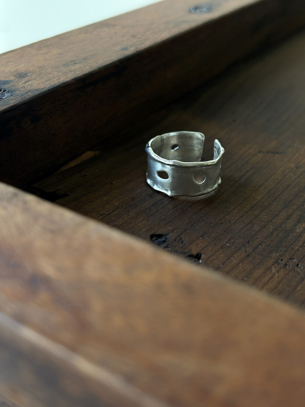 비정형적인 구멍이 나있는 멜팅 디자인의 반지입니다.